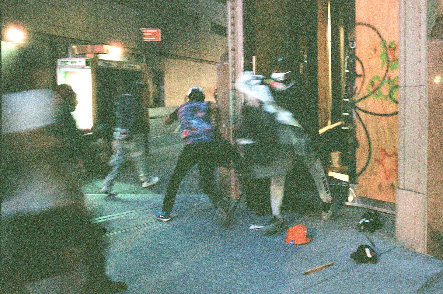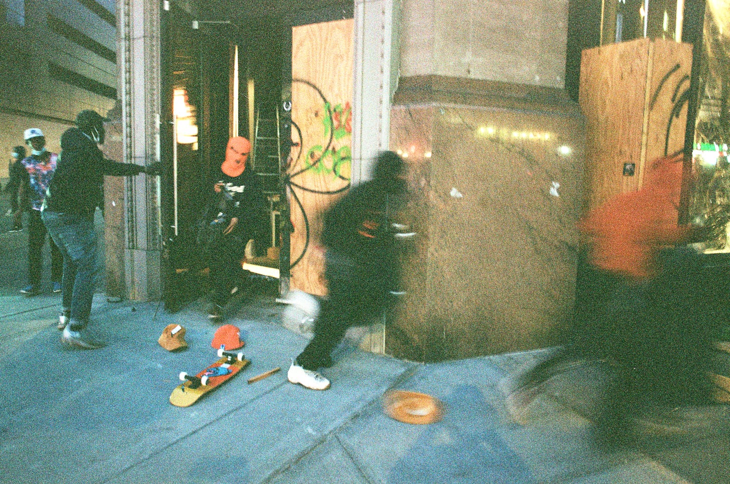 As I reached Union Square, there was a Halal cook smoking a cigarette outside his cart. "Are you open?" I asked. He nodded. "I'll let you smoke your cigarette, don't worry." A group approached and asked to borrow his lighter. They lit a joint and gave the cook a hit. When he returned inside his cart to take my order, "were you open all night?" I asked. "All night," he said. I tipped him double then walked west on 14th Street to find a place to sit down. Fourteenth street had been looted between the park and Sixth Avenue. In Gamestop, the cardboard cutout of a cartoon raccoon standing amid a pile of broken glass and littered shelving, the riot gate flapping in the wind off its track. I struggled to eat my food without getting glass in it, many nearly and microscopic pieces being embedded in my fingers.