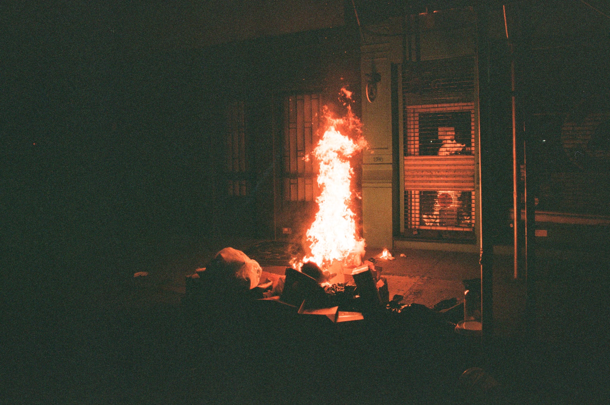 Looting continued rampantly in SoHo, then on Broadway at Howard Street a scene of utter chaos unfolded. The Foot Locker was breached and looters swarmed. Someone lit a dumpster on fire and flames raged as the looters ran to and fro with sneakers in their arms. A police vehicle tried to chase a getaway car, then it bolted onto the sidewalk and accelerated madly with bystanders and looters jumping out of its way, myself included, the car narrowly missing my body before it broke free onto Broadway and sped off into the night uncaptured. The dumpster fire was out of control as construction debris inside was popping off spitting flames and smoke into the sky.